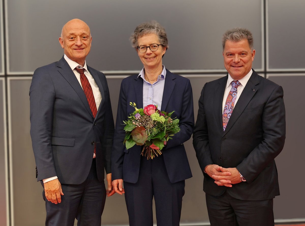 Prof. Dr. Sabine Löbbe (Mitte) wurde zur neuen Präsidentin gewählt. Der amtierende Präsident, Prof. Dr. Hendrik Brumme (links) sowie der Vorsitzende des Hochschulrats, Christian O. Erbe gratulieren ihr zum Wahlergebnis. Foto: Hochschule Reutlingen