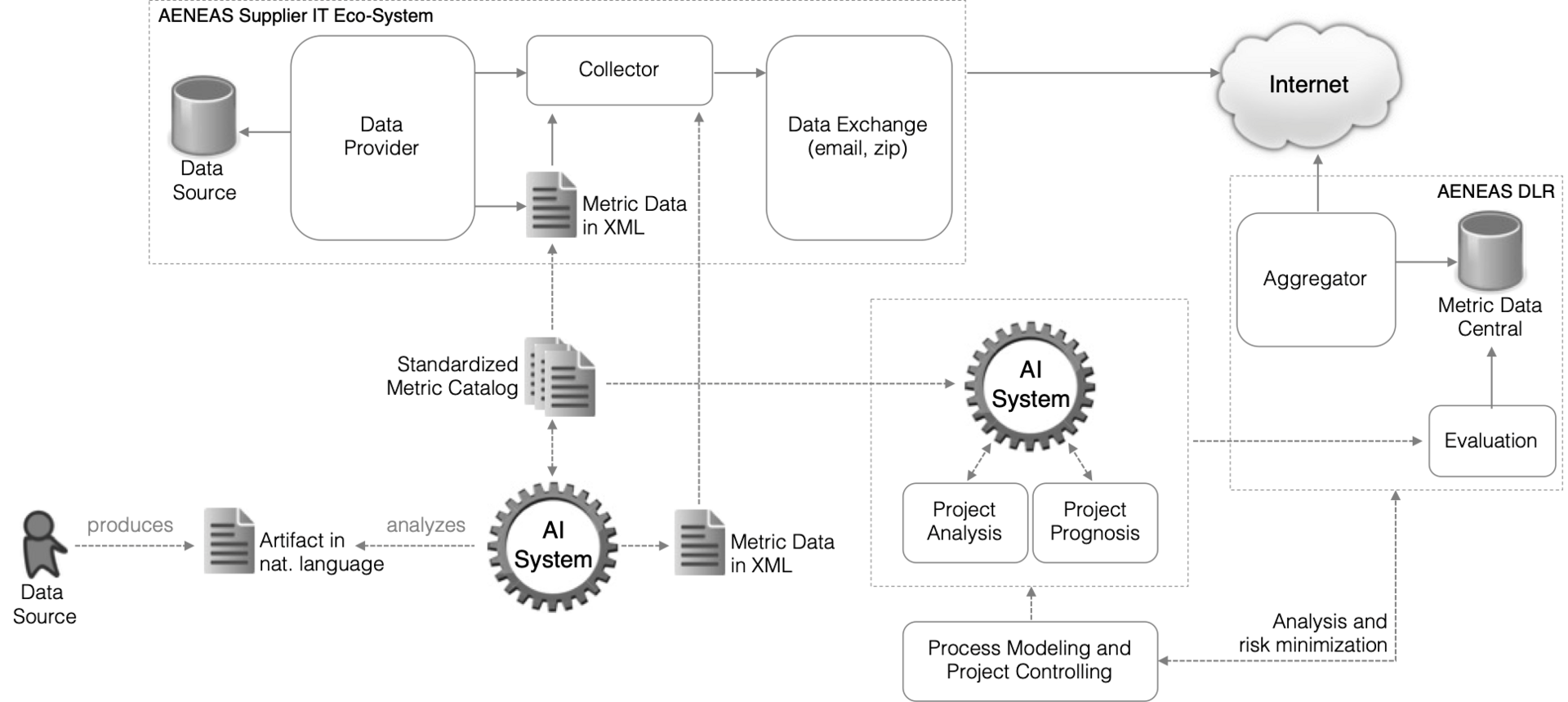 - Erfassung von Messdaten: Aufbauend auf der Struktur des Vorläuferprojekts AENEAS sollen relevante Artefakttypen (Code, Anforderungen etc.) identifziert werden. Für diese Artefakttypen sollen relevante Metriken identifiziert und in einem standardisierten Metrik-Katalog erfasst werden. Für die identifizierten Metriken soll untersucht werden, in welchem Umfang KI eingesetzt werden kann, um diese Metriken zu erfassen. Ein besonderer Fokus liegt hierbei auf der Behandlung von Anforderungen in natürlicher Sprache.