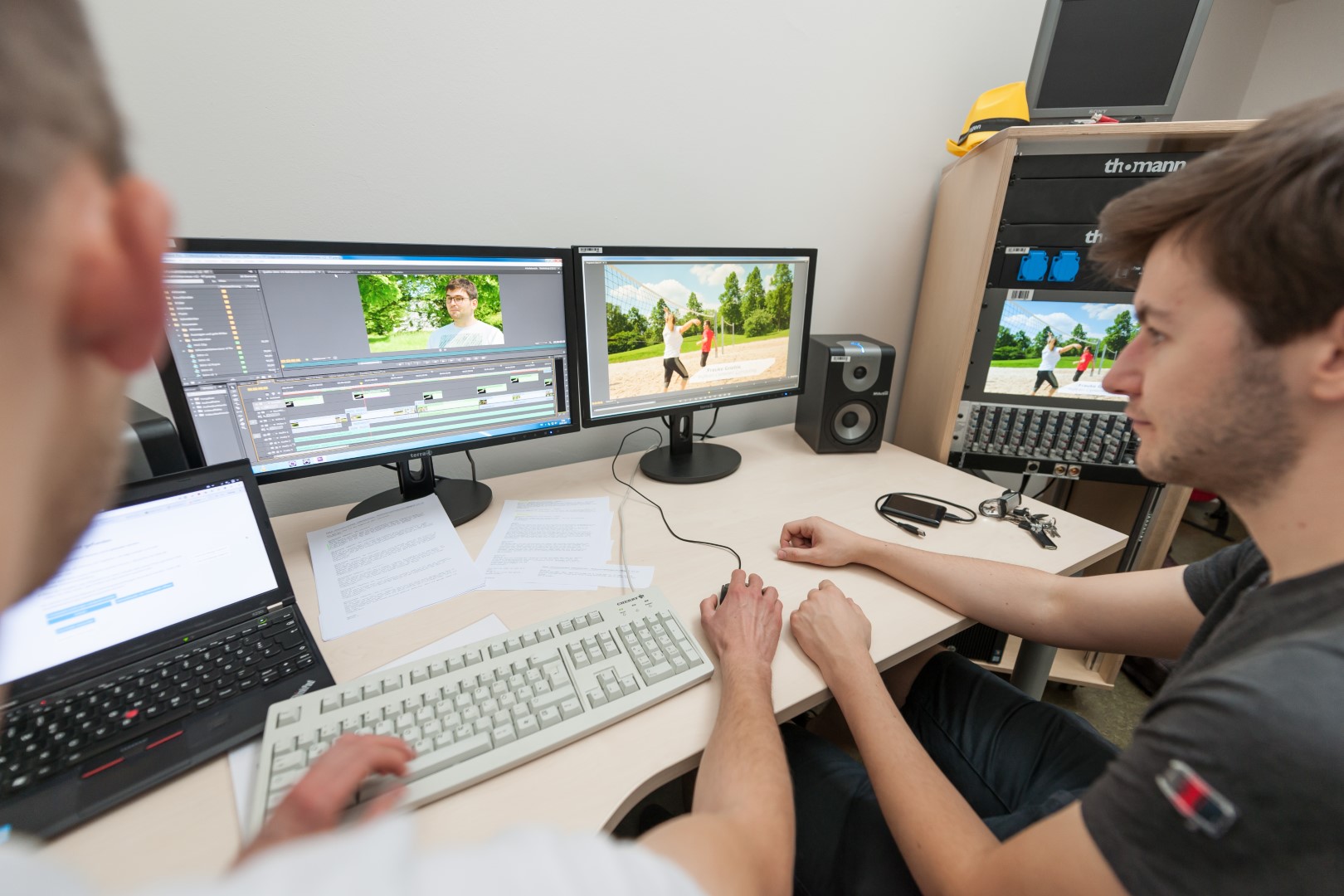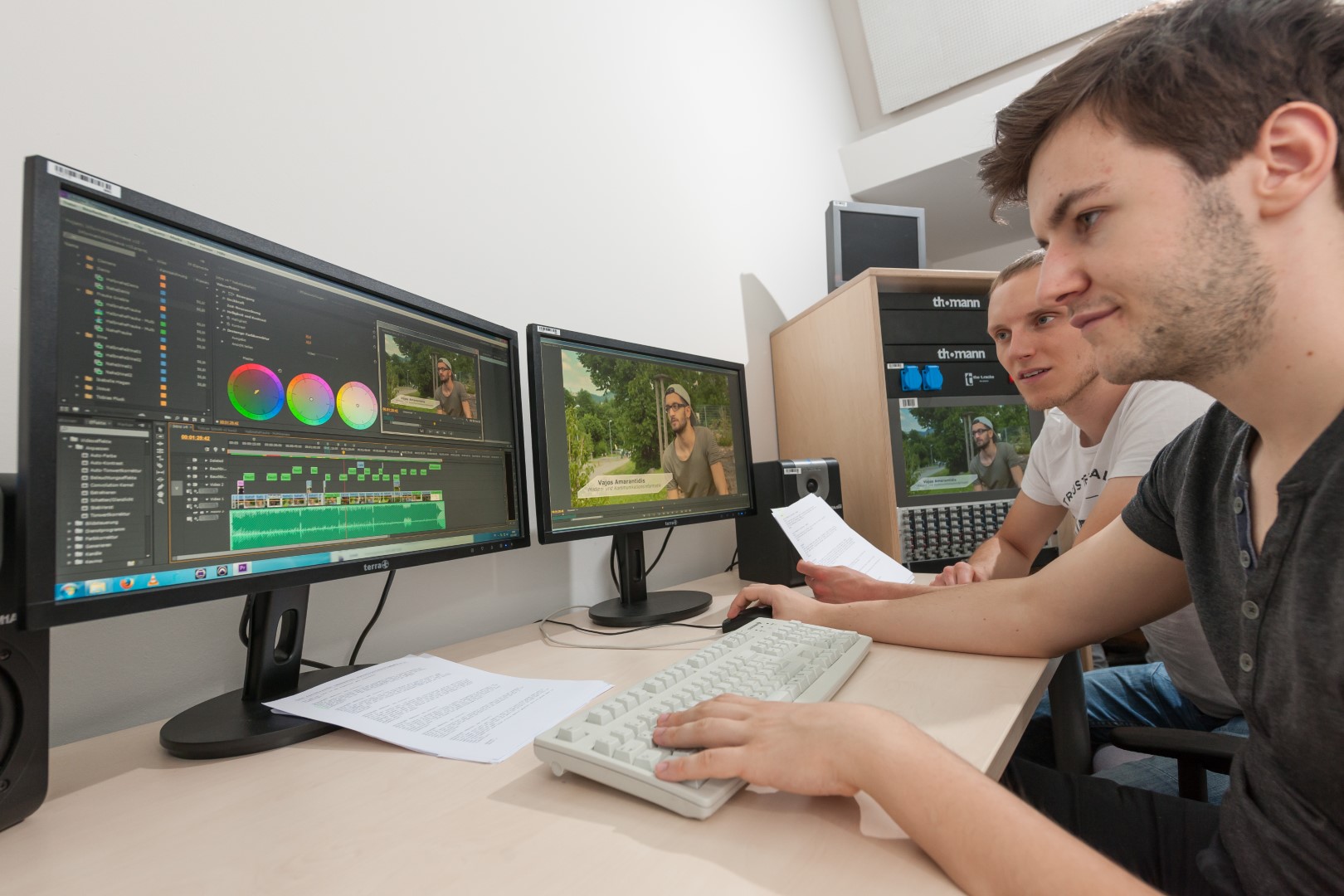Die in den verschiedenen Modulen entstandenen Medien wie Videos und Tonaufnahmen können in unseren Media-Suites auf leistungsstarken iMacs bearbeitet (und zur Veröffentlichung gefinished) werden. Unsere Studierende arbeiten hier mit den Branchenstandards entsprechenden Programmen für Ton- und Bildbearbeitung. Postproduktionsprozesse wie Videoschnitt, Farbkorrektur und Colorgrading werden hier erlent, aber auch Animationen und Tonproduktionen produziert.