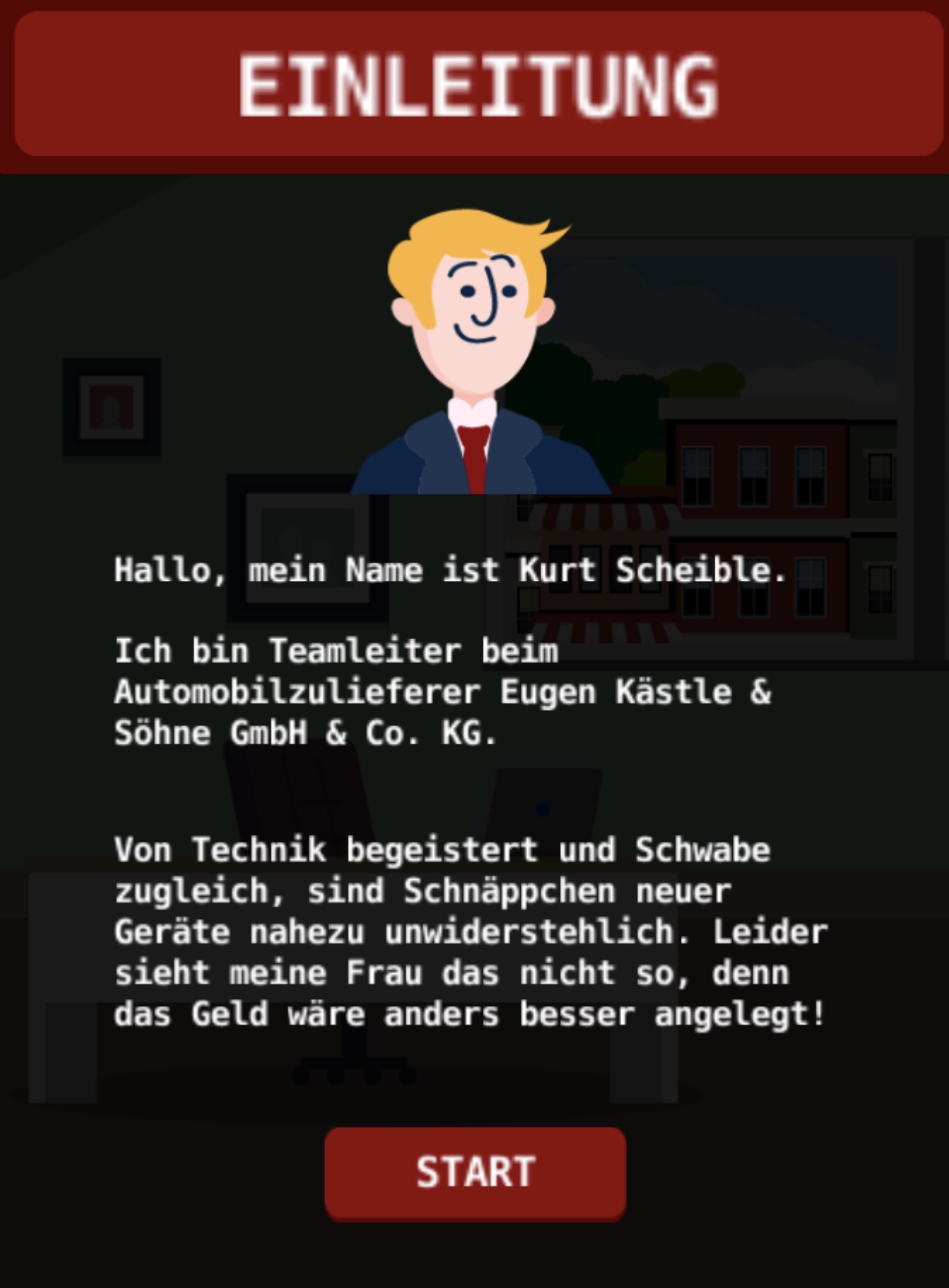 Wer ist im Arbeitsalltag nicht mal abgelenkt und vielleicht auch etwas zu gierig im Umgang mit verlockenden Angebotsseiten? Aber was kann schon Schlimmes passieren?! Einiges, wie das Serious Game "How Much Is The Fish" von Alexander Riexinger beweist: in diesem Spiel nutzt ein eloquente Cyberkriminellenpaar die Unbedarftheit und Gutgläubigkeit von mehreren Menschen aus, die Folgen sind für die Betroffenen gravierend. Entstanden als Bachelorarbeit im Zusammenarbeit mit SYSTAG, umgesetzt mit defold.