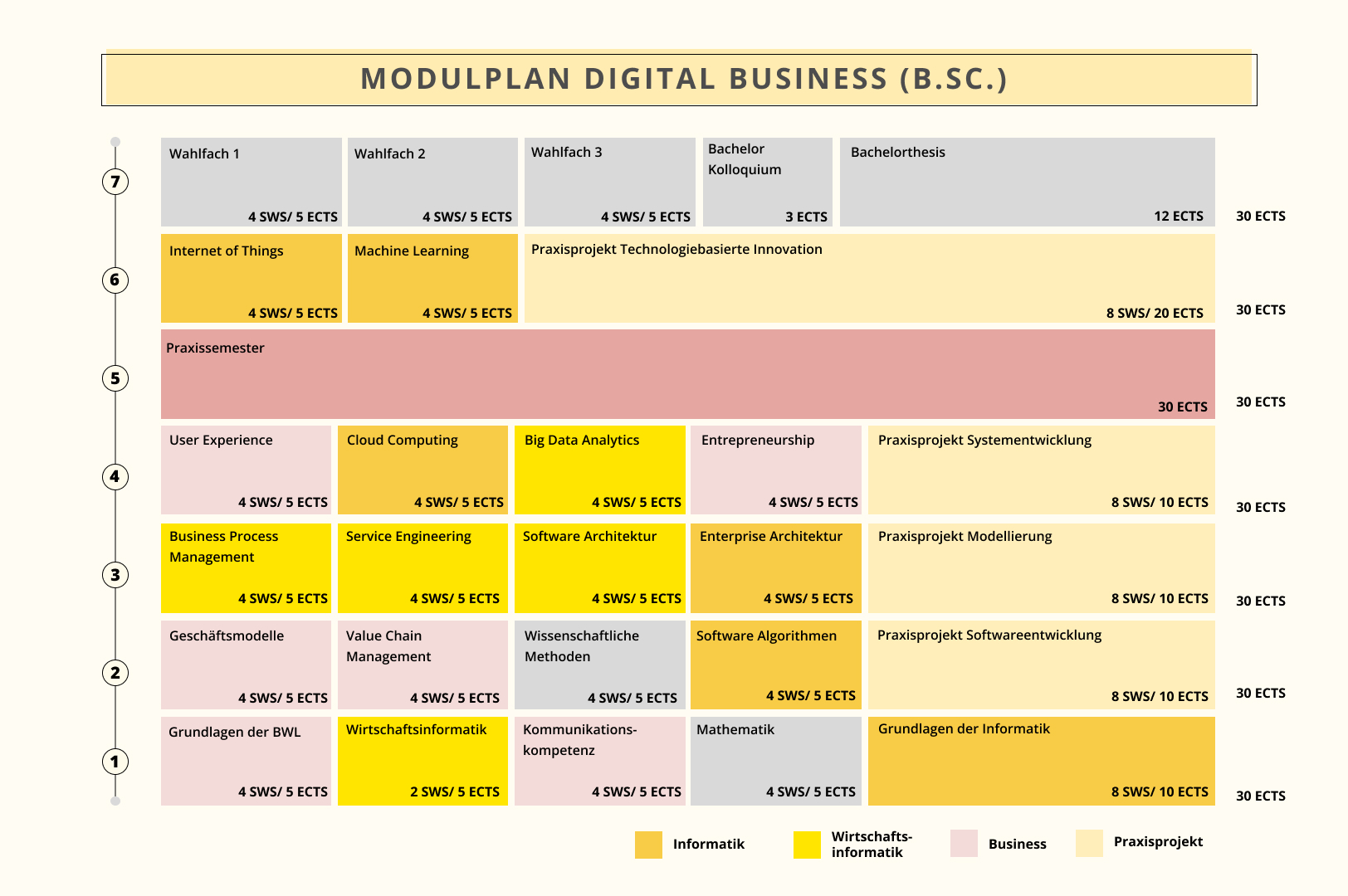 Die praxisorientierte Ausrichtung des Studiengangs zeigt sich insbesondere durch die Praxisphase im 5. Semester und die kontinuierliche Umsetzung projektorientierter Lehrveranstaltungen über alle Semester hinweg. „Learning by Doing“ ist hier das Motto. So lernst Du im Praxisprojekt Entrepreneurship bei, Deine eigene Vision zu verwirklichen. Abgerundet wird das Programm durch Wahlfächer, die Dir die Möglichkeit einer Vertiefung bieten, und die Bachelorthesis.