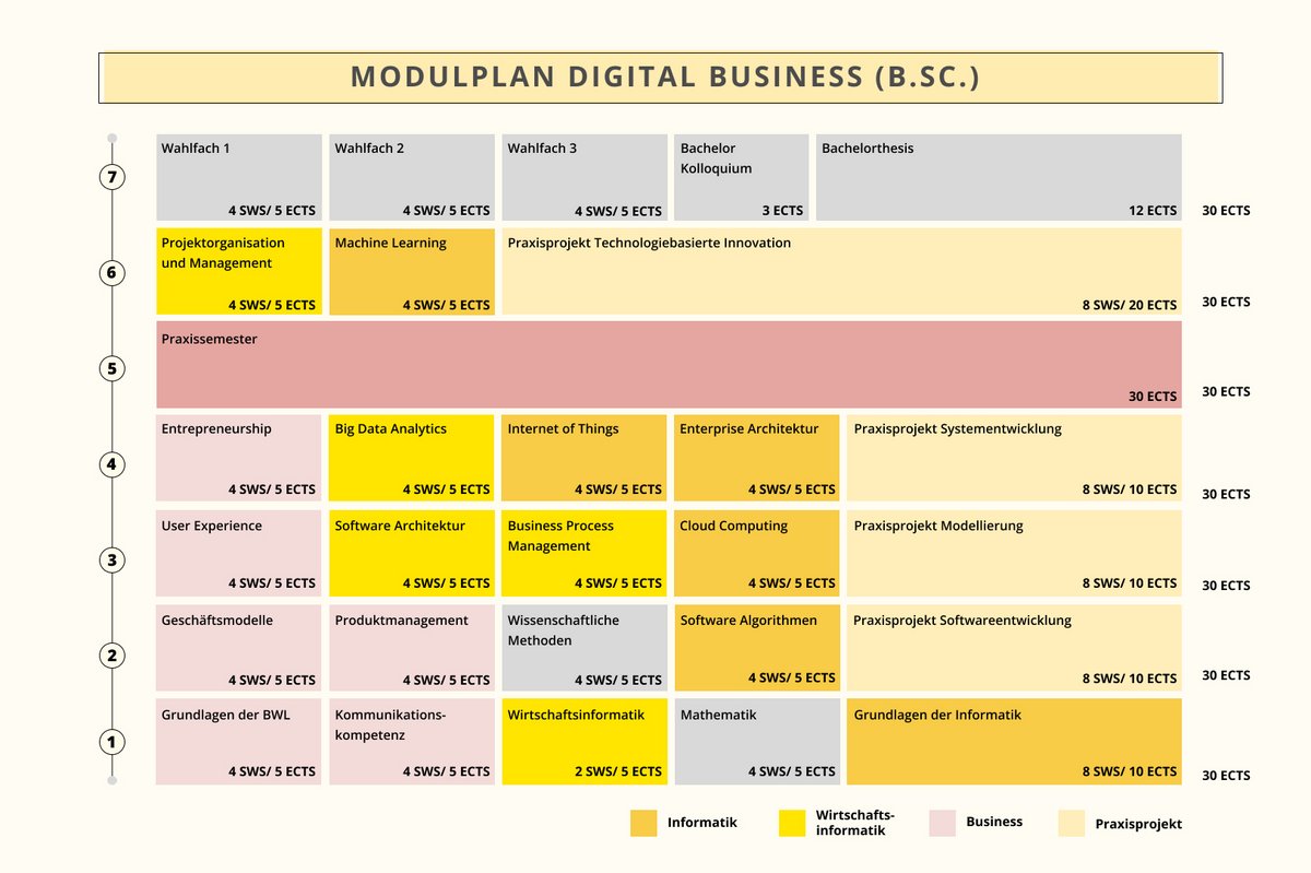 Der Studiengang Digital Business ist ein spezialisierter Teilbereich der Wirtschaftsinformatik und beschäftigt sich im Kern mit der digitalen Transformation. Der Studiengang kombiniert hochaktuelle Themen aus den Bereichen Wirtschaftsinformatik und Wirtschaftswissenschaften. In den ersten Semestern werden dabei wichtige Grundlagen vermittelt, bevor in den höheren Semestern vermehrt interdisziplinäre Veranstaltungen angeboten werden.