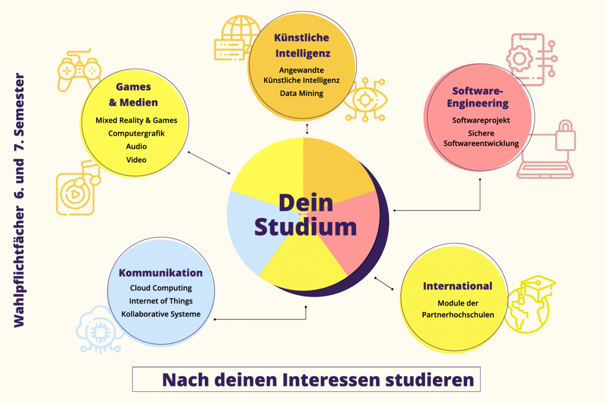 In einem vollständigen Software-Engineering-Studium mit besonderem Augenmerk auf Kommunikation und Medien, lernst Du angewandte Informatik von Grund auf und qualifizierst Dich für vielfältige Berufsfelder.Deine Spielwiese: Von Games über KI bis BigData