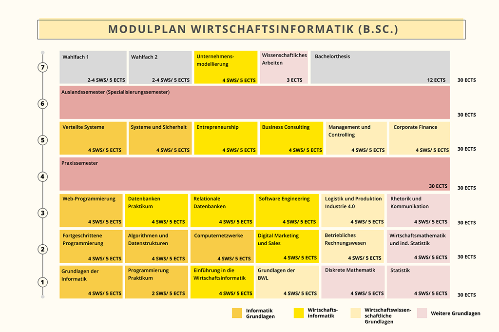 In Deinem Studium der Wirtschaftsinformatik (WI) beschäftigst Du Dich mit der Frage, wie man Geschäftsprozesse nachhaltig gestaltet sowie betriebliche Informationssysteme designt, entwickelt und in Unternehmen praktisch anwendet. Entscheidend ist deshalb, dass Du Dich in beiden Welten auskennst. Während Deines Studiums lernst Du wichtige Grundlagen der Betriebswirtschaftslehre und der Informatik. Programmieren und Software-Engineering trifft auf Produktionsmanagement, Controlling und Finance. Die Schnittmenge beider Bereiche ist die Fähigkeit zu abstraktem Denken. Du lernst, das große Ganze zu betrachten und daraus wichtige Schlüsse für die Praxis zu ziehen. Deine interdisziplinäre und internationale Ausbildung macht Dich zum gefragten Spezialisten, zur gefragten Spezialistin. Als Informatik-oder Projektmanager:in, Entwickler:in oder Berater:in machst Du Betriebe und Konzerne fit für die Zukunft.