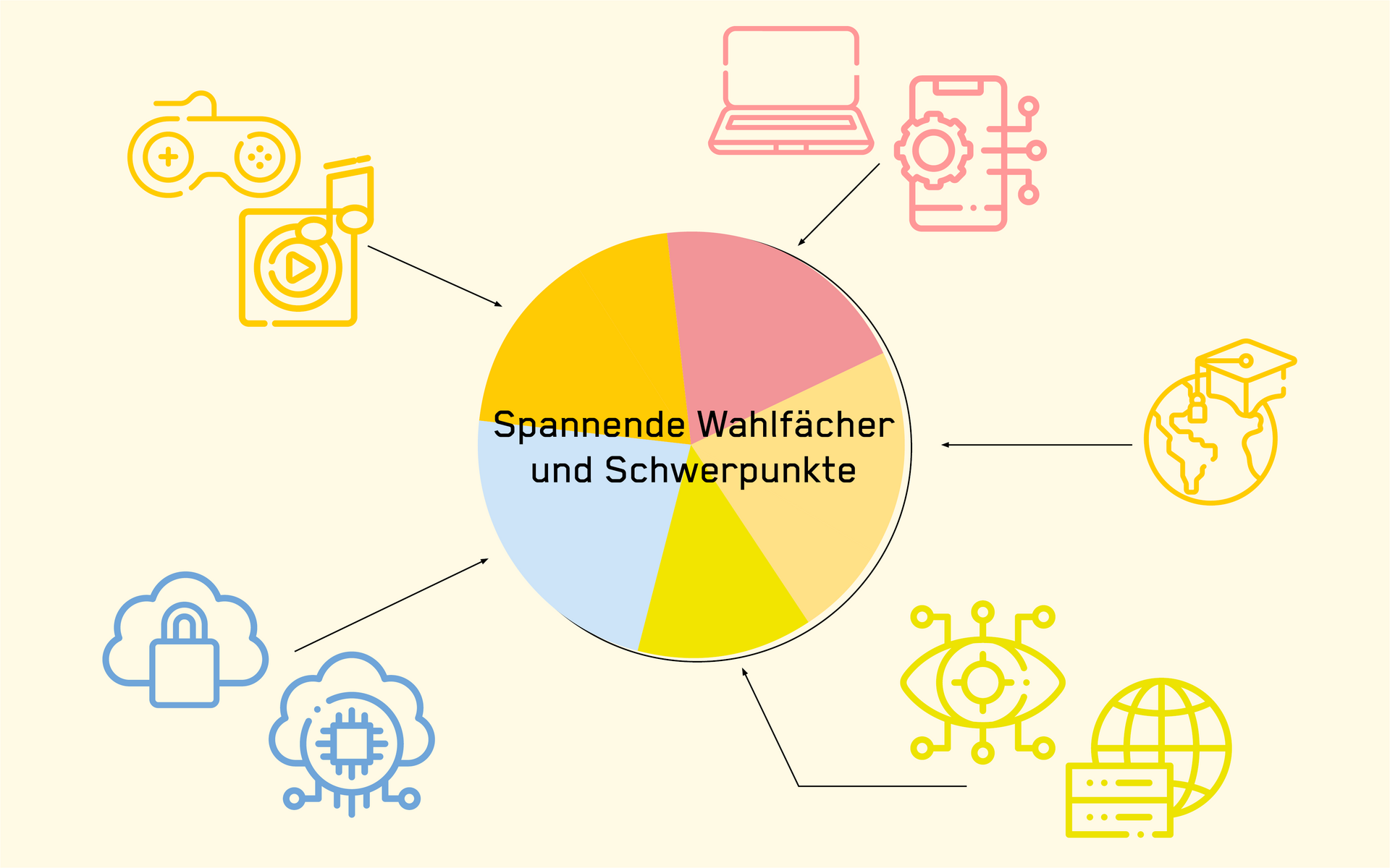 Mit Wahlfächern aus der Wirtschaftsinformatik, Medien- und Kommunikationsinformatik, Medizinisch-Technischen Informatik und anderen Fachbereichen gestaltest Du Dein Studium individuell und kannst mit Praxis-Projekten, Praktika und einem möglichen Auslandssemester wertvolle Erfahrung sammeln.Deine Zukunft: Die Vernetzung der Wirtschaft